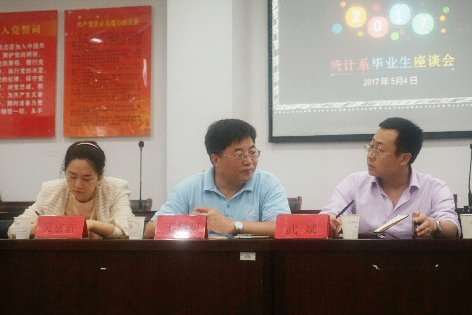 5月4日中午,星空平台在行政楼28-118党员之家召开了2017届毕业生师生座谈会。统计系系主任王黎明、副主任武斌、党总支副书记吴京京及全体教师、2017届毕业生代表参加了此次座谈会。